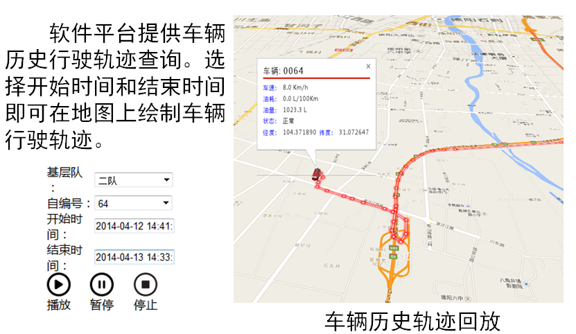 可查询任意时间段的历史数据,并具备报表输出、远程打印、曲线展示等功能。并可在项目验收完成后针对用户需求后续增加包含车辆信息、数据起止时间、行车油耗、施工油耗、非正常油耗、行车距离、行车时间、施工时间、加油时间、加油数量。曲线内容包含速度曲线(公里/小时)、里程曲线(公里)、油位容量(L)、油位百分比曲线。