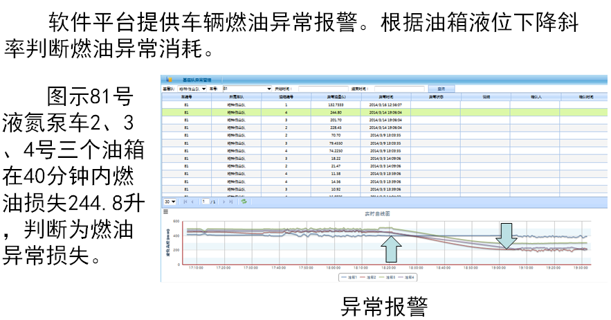 车辆油料异常监控实时报警,统计车辆在某一段时间内的燃油异常减少(燃油减少量超过车辆最大正常消耗量),包含时间、油量减少量、剩余油量等数据。