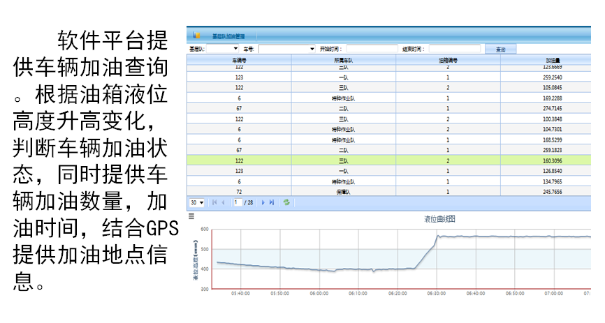 具备车辆加油数据统计功能。当车辆油位增加时,记录为加油,包含加油时间、加油量、加油后的总油量等数据。