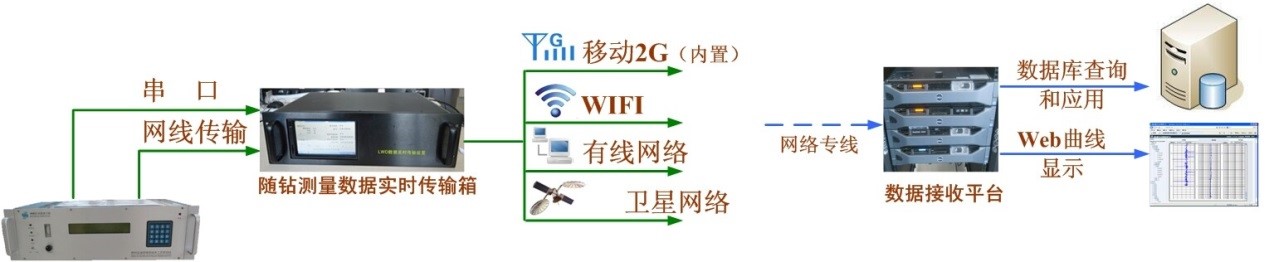 在定向服务施工时,配备专门的嵌入式采集传输设备,该设备具备串口、RJ45网口以及无线通讯模块,针对不同厂家、不同型号的定向仪器开发的通讯接口程序和采集程序、传输程序均固化在该设备中。施工作业时,根据不同型号的仪器选择不同的连接方式连接仪器解码接口箱和通讯接口箱,启动采集程序进行定向数据的采集,并通过井场覆盖的WIFI信号连接油田分公司内网,实时将定向数据传输到数据库中。在移动微波不能搭建链路的井场,也可以通过GPRS或者卫星方式进行数据传输。